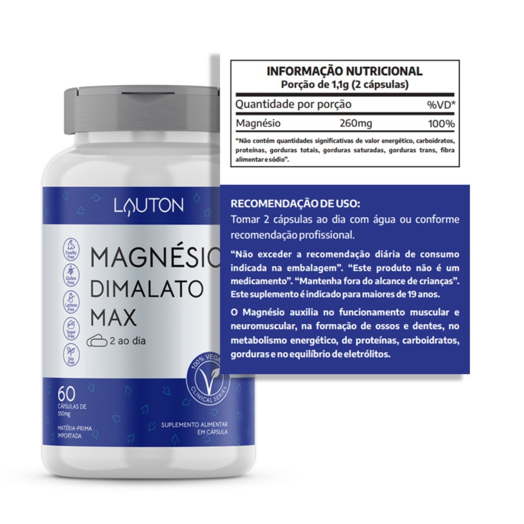 Devido às suas propriedades antioxidantes e anti-inflamatórias, o magnésio dimalato da Lauton Nutrition auxilia no combate a infecções, além de ajudar na prevenção do envelhecimento precoce e o fortalecimento do sistema imunológico. Ele também é super importante para fortalecimento de ossos e dentes, na prevenção e tratamento de dores reumáticas, na redução de estresse, e na melhora de cãibras visto que promove o relaxamento muscular. Ele também pode, pelo mesmo motivo, ser um aliado para o tratamento de insônia, sendo uma fonte a mais para o corpo entrar no estado ideal para um sono recuperador.